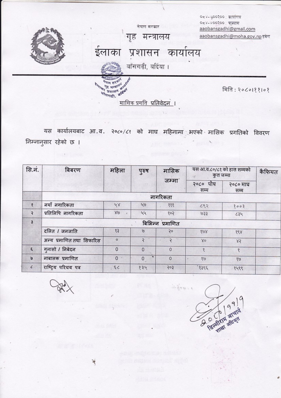 २०८० माघ महिनाको मासिक प्रगति विवरण